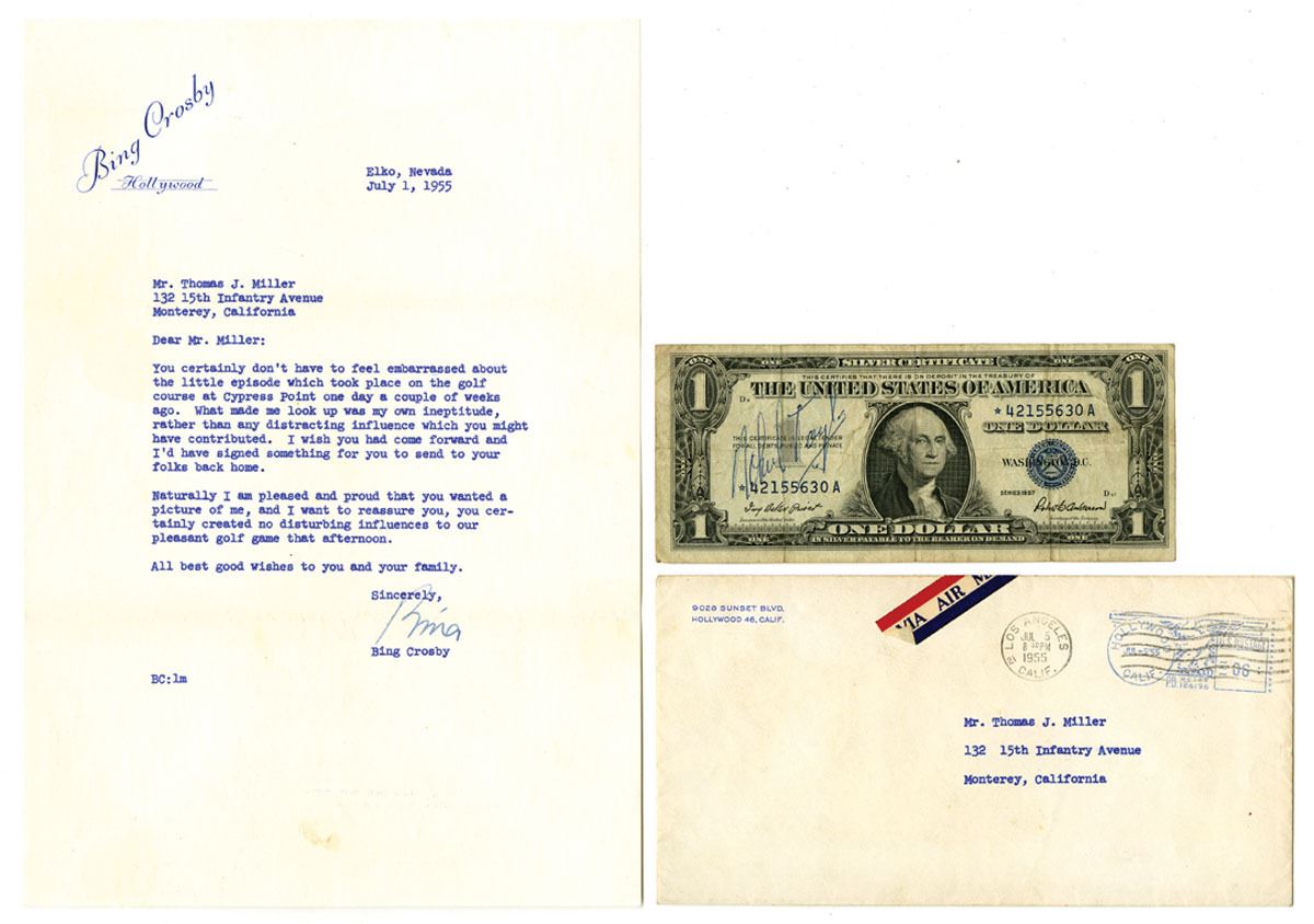 Lot of 2 Signatures, Includes: $1, Series 1957, Silver Certificate Signed by Robert Taylor - who was one of the most popular leading men of his era. Also included is a typed letter signed by Bing Crosby referring to a 'little episode which took place on the golf course.' Letter comes with original envelope. VF to AU condition. (2). Sold "AS IS" no returns accepted.