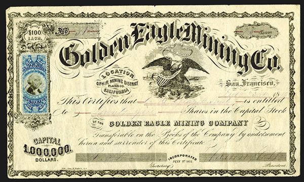 San Francisco, California offices, Ophir Mining District, Placer County, 20 shares, #31, patriotic eagle, blue 25 cents revenue affixed, VF+.