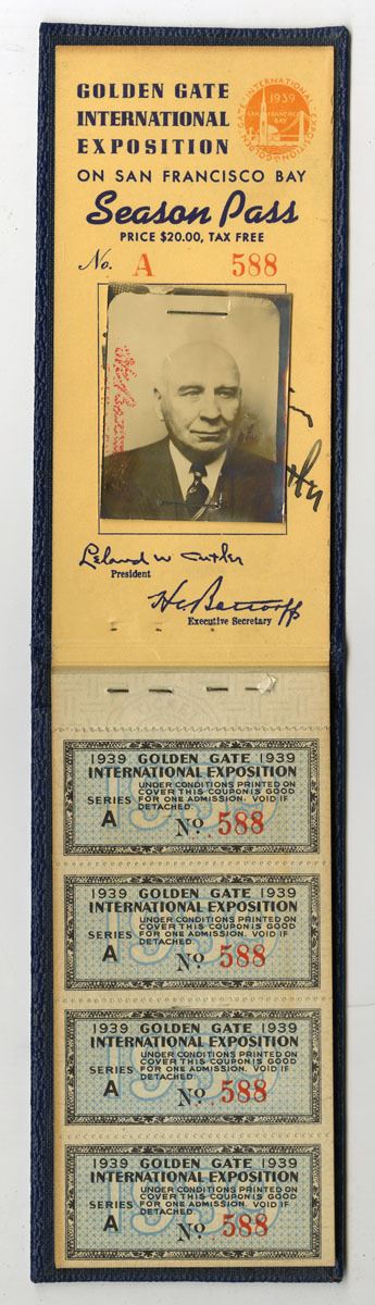 San Francisco, California, 1939. Embossed folder with 21 sheets of 4 coupon entrance tickets included in booklet, Picture of owner - Frank Merriam, at top, S/N 588, XF to AU condition. Frank Finley Merriam (December 22, 1865 – April 25, 1955) was an American Republican politician who served as the 28th governor of California from June 2, 1934, until January 2, 1939. Assuming the governorship at the height of the Great Depression following the death of Governor James Rolph, Merriam defeated the Democratic candidate Upton Sinclair in the California gubernatorial election in 1934. Merriam also served as the State Auditor of Iowa from 1900 to 1903, and served in both the Iowa and California state legislatures.