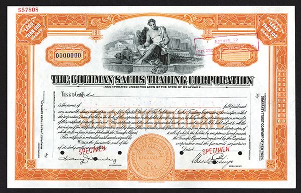 Delaware incorporation, New York offices. Orange border, semi-nude seated male, factories beyond, ABNC, EF. Launched in December of 1928, this closed-end fund failed during the Stock Market Crash of 1929, allegedly due to accusations of share price manipulation and insider trading.