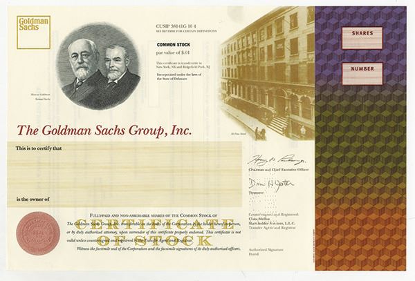 New York, (DE Inc.) 1999, Odd Shares, Pin-Punch Specimen Stock, Black on multi colored border and underprint, Picture on top right of 30 Pine St offices and portraits of Marcus Goldman and Samuel Sachs top left, VF-XF condition, ABNC.