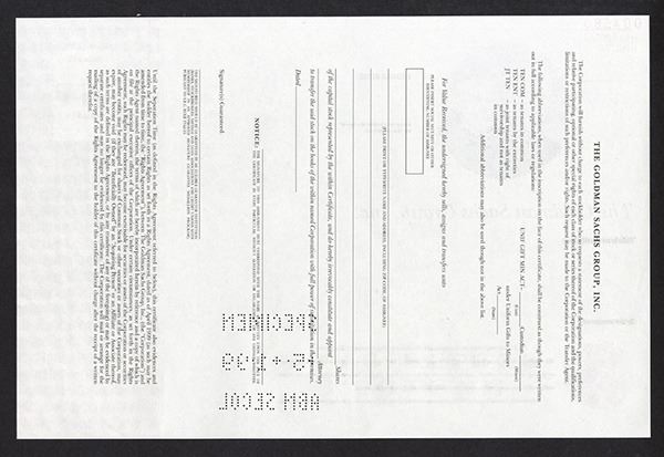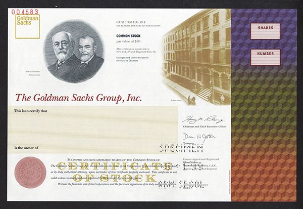 Delaware, 1999, Pin-Punch Specimen, Black on multi colored border and underprint, Picture on top right of 30 Pine St offices and portraits of Marcus Goldman and Samuel Sachs top left, Uncirculated condition, ABNC.