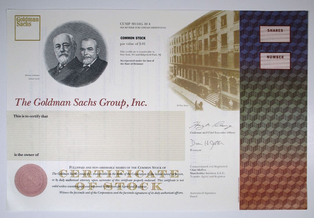 New York (Inc. in Delaware), 2000s. Odd Shares Specimen Stock certificate, Black text with multicolored border at right adjacent to a line of buildings. Specimen POCs, XF condition. The Goldman Sachs Group, Inc., is an American multinational investment bank and financial services company headquartered in New York City. It offers services in investment management, securities, asset management, prime brokerage, and securities underwriting.