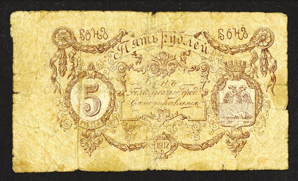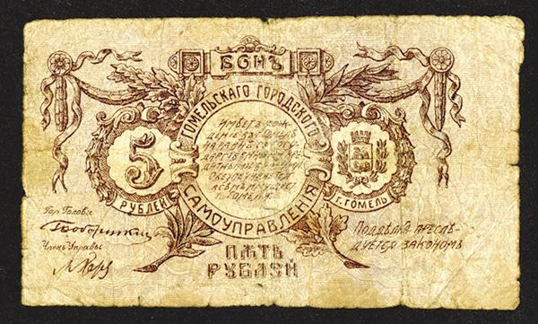 Russia / Belarus, issued 5 Rubles, local issue of Gomel Self-Government (located in Belarus today), uncommon type not listed in the Standard Catalog, Very Good to Fine condition.