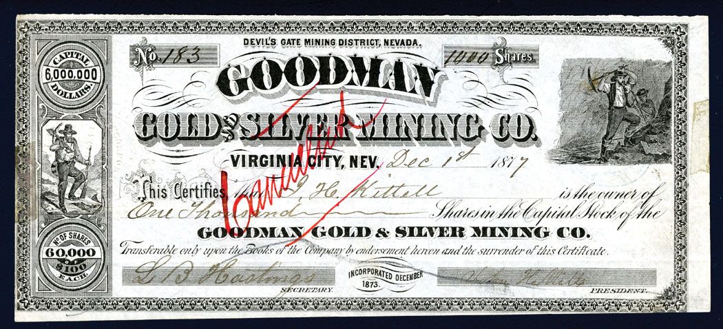 Virginia City, Nevada, 1877, 1000 Shares, Issued and ink cancelled, Miners on left and right with title in middle, Mines located in Devil's Gate Mining District, S/N 183, VF condition.