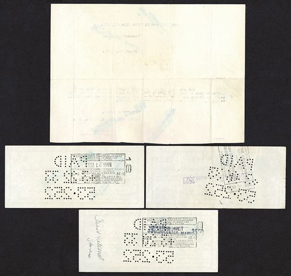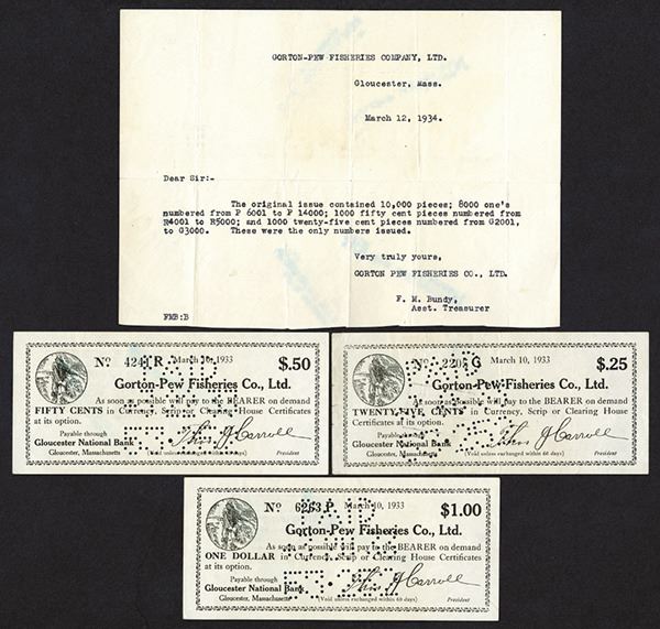 Massachusetts. 25, 50 Cents, 1 Dollar. Bearer certificates drawn on the Gloucester National Bank. With letter informing of number range used for the various denominations. Perforated Paid. 3 pieces with letter.