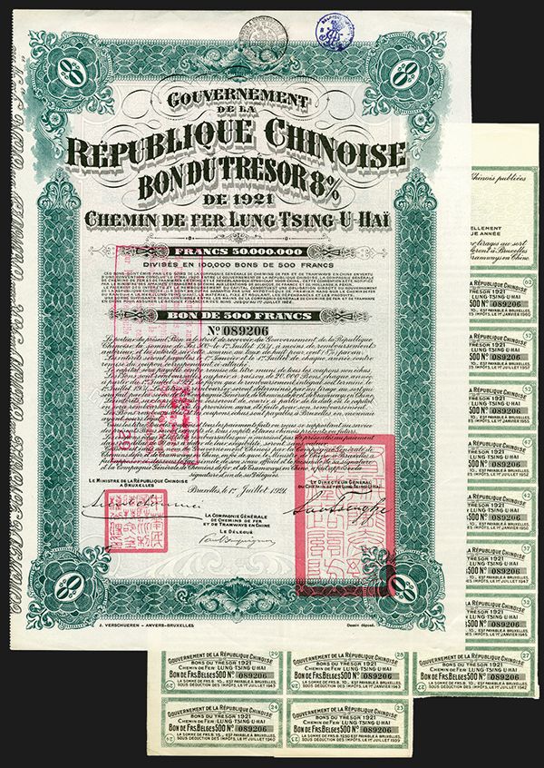 Gouvernement de La Republique Chinoise Bon Tresor, 8% 500 Francs Bond. China. Uncancelled, Black on green border, XF condition.