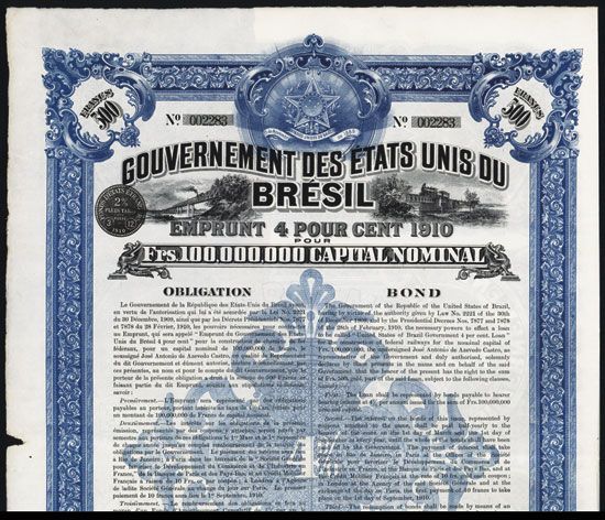 Brazil, 1910, 500 Francs, 4% Loan, Issued and Uncancelled Bond, #002283, Black on blue border and underprint, Locomotives moving over bridges on top left and right, VF condition, Bradbury, Wilkinson & Co.