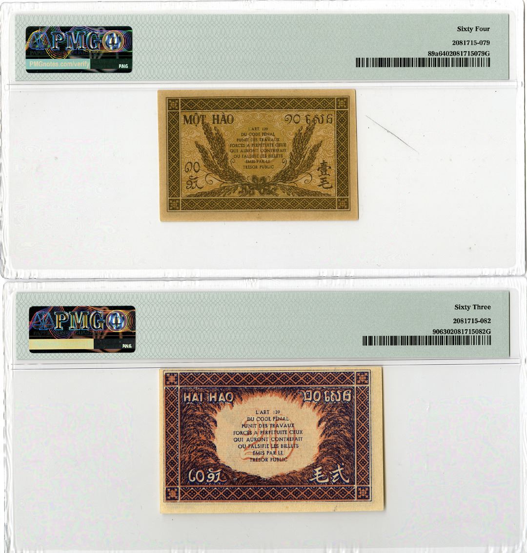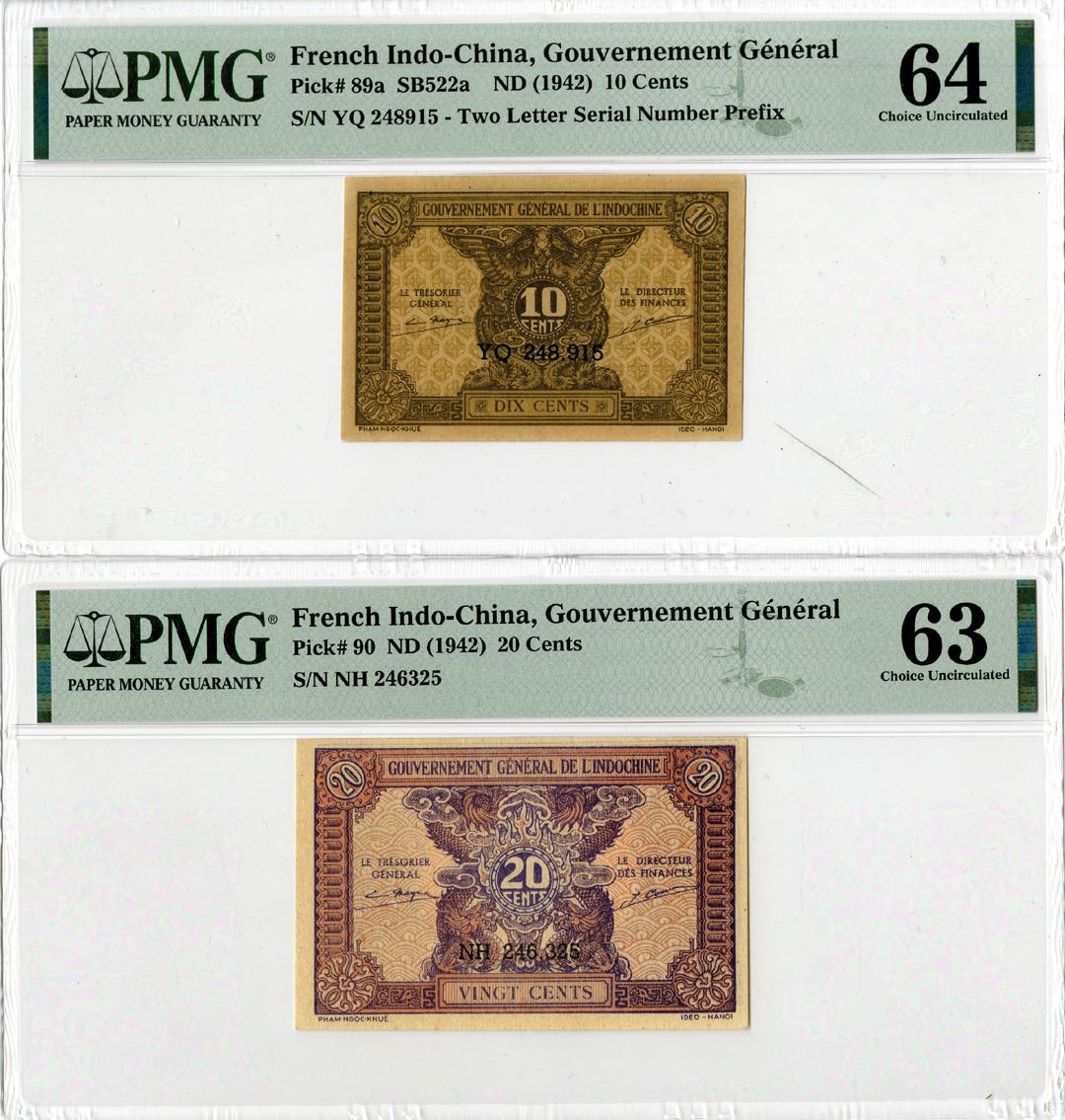 French Indo-China, ND (1942). 10 Cents, P-89a/SB522a, and 20 Cents, P-90, Pair of Issued Banknotes. Both are PMG graded. First is Choice Uncirculated 64 and the other is Choice Uncirculated 63.