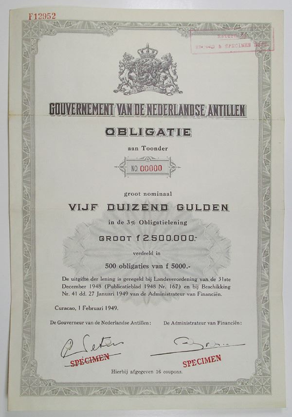 Curacao, Netherlands Antilles, 1949. Specimen 3% Coupon Bond in Dutch, Black text with gray border and undertint, Netherlands coat of arms depicted at top center. Red specimen overprints, 00000 serial number, and POCs. VF condition, ABNC.