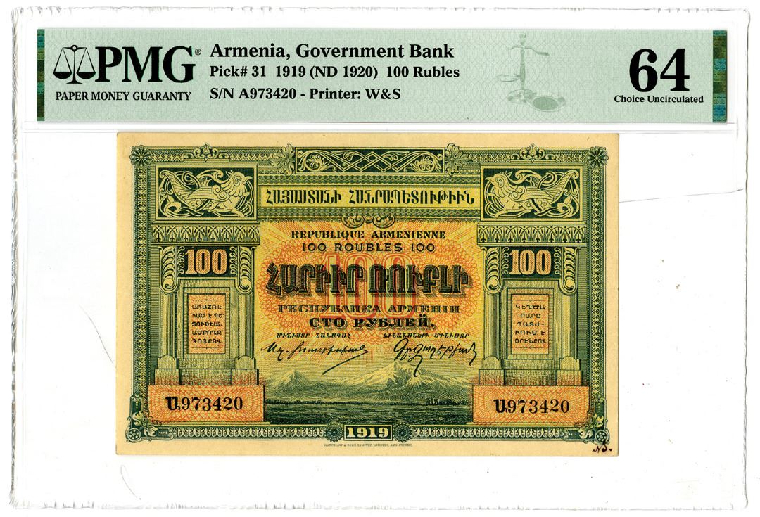 Armenia. 1919 (ND 1920). 100 Rubles, P-31, Issued banknote, Green on orange and yellow underprint, S/N A973420, PMG graded Choice Uncirculated 64 with comment "Annotation". Printer: W&S.