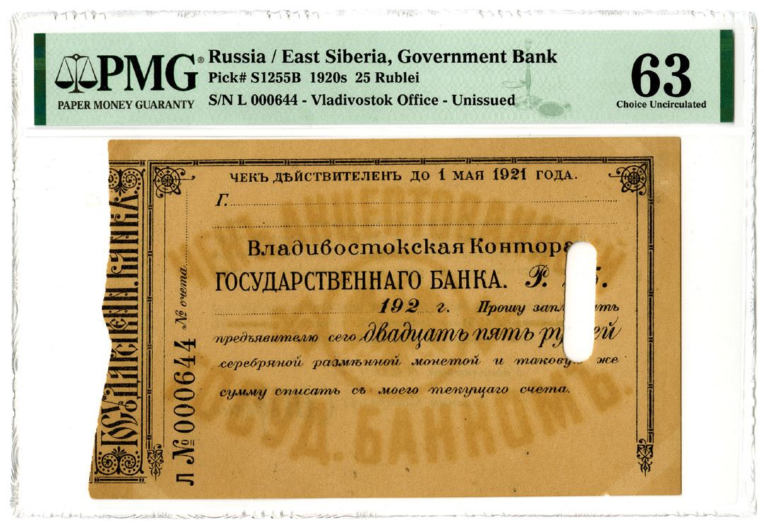 Russia / East Siberia. 1920s. 25 Rubles, P-S1255B, unissued banknote, PMG Graded Choice Uncirculated 63 with comment "Toned". Only 2 examples graded in the PMG census, both at this grade.