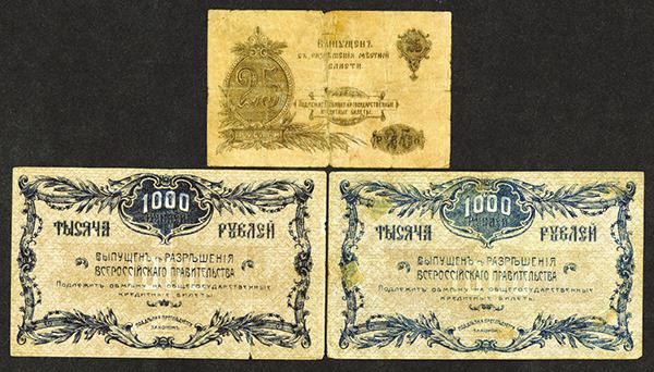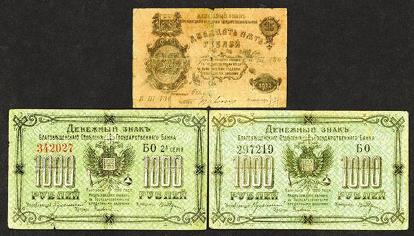 Russia - East Siberia. Blagoveshansk. 1000 Rubles. P-S1259C (2) Fine or a bit better; Orenburg. 25 Rubles. P-S977. Good. 3 pieces. (The Pogrebetsky Family Archives)
