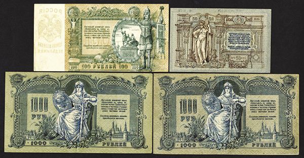 Russia - South Russia. Currency Tokens Issue. 50, 100, 1000 Rubles. P-S416a, S417b, S418a, b. First with pencil notations in margin on both sides, otherwise a nice matching Very Fine group. 4 pieces. (The Silicon Valley Collection)