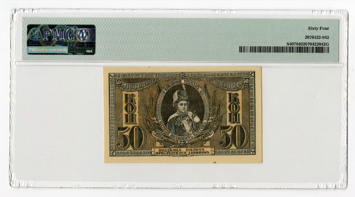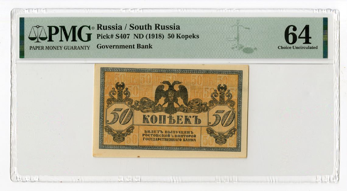 Russia - South Russia. ND (1918). 50 Kopeks, P-S407, Issued banknote, Black on orange underprint with double headed eagle at center, Back is blue on orange underprint, PMG graded Choice Uncirculated 64 EPQ