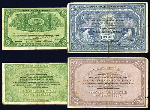 Lot of 2 notes, Russia, Both 1918 ND issues, Includes 3 Rubles, P-S101a, Issued, Choice VG with small hole in middle and 25 Rubles, P-S104, Issued, appears Fine to Fine+ but there is a small tear on the lower left border. Attractive pair of notes.