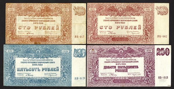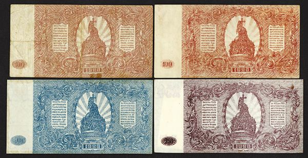 Russia - South Russia. Treasury Notes. 100, 250, 500 Rubles. P-S432c (2), S433b, S434. One of the first Fine, others Choice Very Fine or a bit better. 4 pieces. (The Silicon Valley Collection)