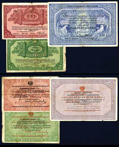 Lot of 3 notes, Russia, All are 1918 Provisional issues, Includes 3 Rubles, P-S106, Issued, Choice Fine; 10 Rubles, P-S107, Issued, Choice Fine; 25 Rubles, P-S108, Issued, appears Choice Fine condition. Attractive trio of notes.