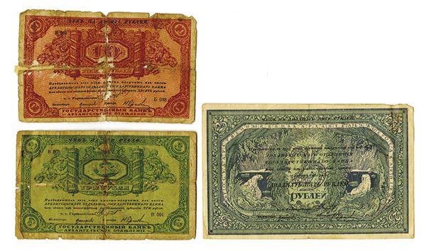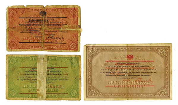 Russia - North, lot includes issued 25 Rubles, P-S108; 10 Rubles, P-S107; and 3 Rubles, P-S106. All carry the red regime validation overprints. The first Very Fine, the other two are Good with tears and tape repairs.