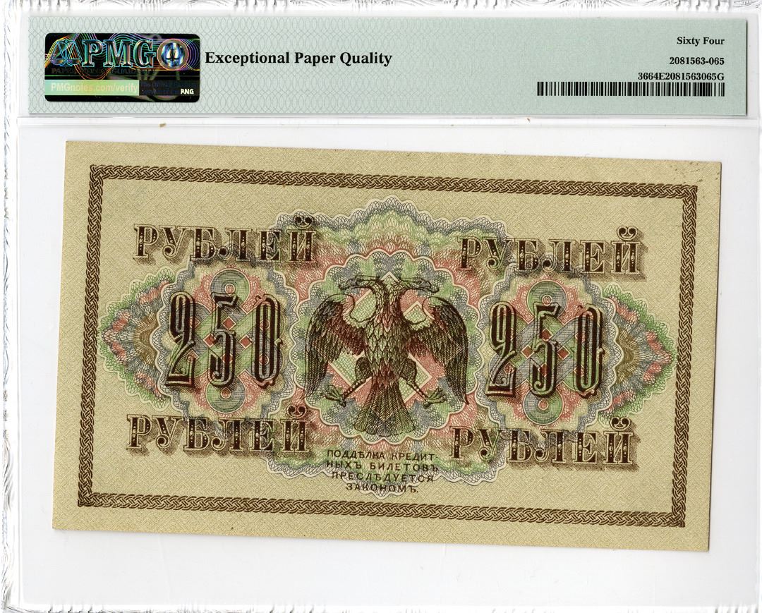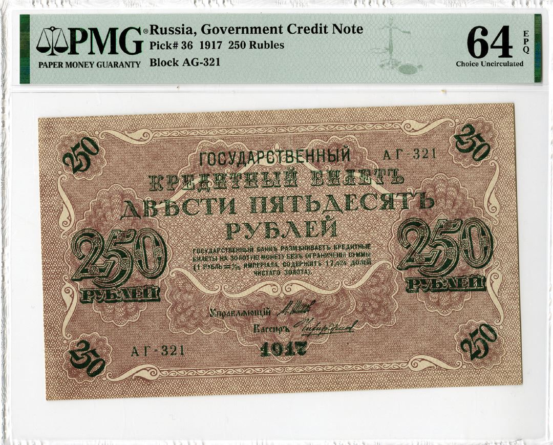 Russia, 1917. 250 Rubles, P-36, Issued Banknote, Black on lilac underprint with Swastika in underprint on back, Block AG-321, PMG graded Choice Uncirculated 64 EPQ.