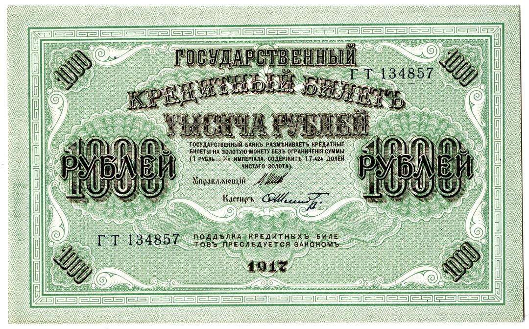 Russia. 1917. 1000 Rubles, P-37, Issued banknote, Dark brown on green underprint, Uncirculated condition.