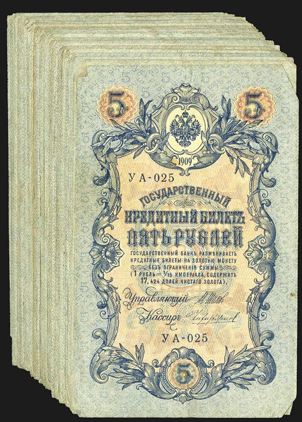 Russia. Government Credit notes, 1909 and 1917 issue of 1909 dated notes. 5 Rubles. SCWPM 10 (27); SCWPM 35a (10). Series # only. Generally Very Good or so. Some with edge issues. 37 pieces.