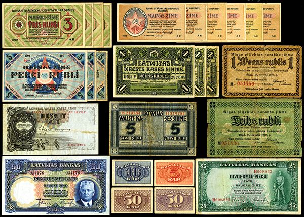 Government Currency & Small Exchange Notes, 1919-38, Group of 26 Latvia, lot of 16 notes, includes 1 Rublis, P-1 (3 pcs, 1 VF); 5 Rubli, P-3; set of 5-, 10-, and 50 Kapeikas, P-9, P-10, and P-12 (2 pcs); 50 Latu, P-20, XF; 25 Latu, P-21, VF; 10 Latu, P-29, VF; also included are regional notes from Riga's Workers' Deputies' Soviet of 1919, 1 Rublis, P-R1 (6 pcs); 3 Rubli, P-R2 (4 pcs); and 5 Rubli, P-R3 (3 pcs). Lastly 1 Rublis and 3 Rubli, 1919, Riga local issue.