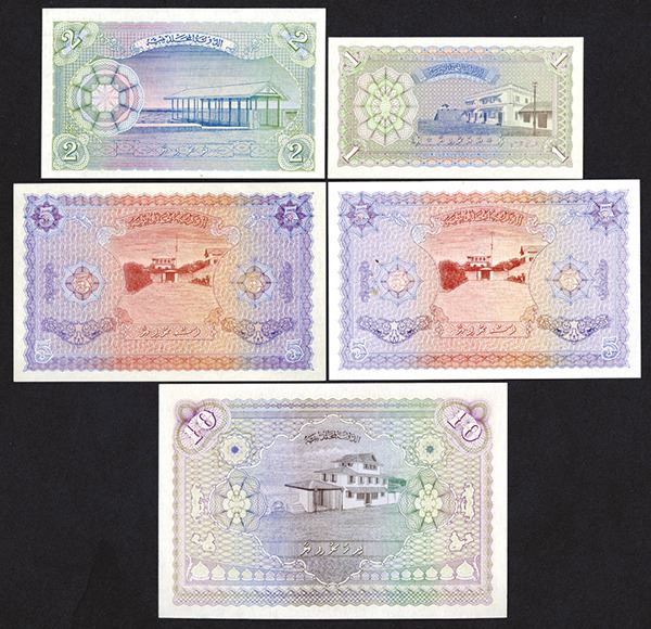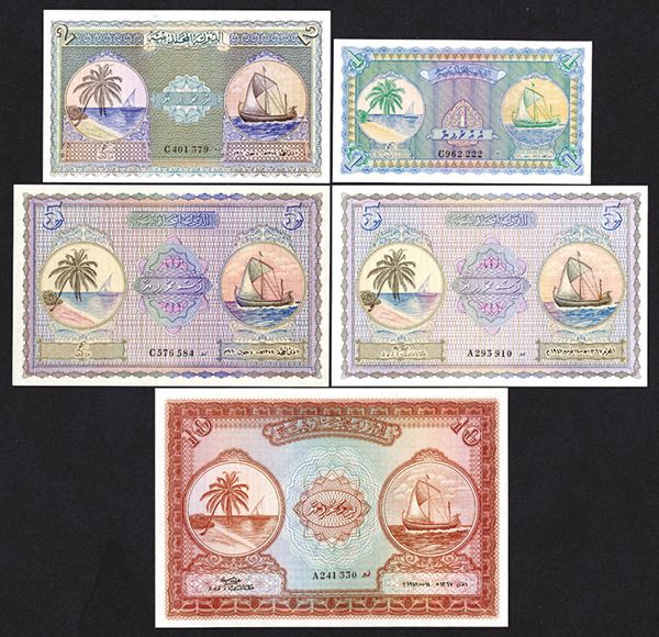 Maldives. 1, 2, 5, 10 Rupees. P-2b, 3b; 4a, b; 5a. All Choice Uncirculated and very nice. 5 pieces.