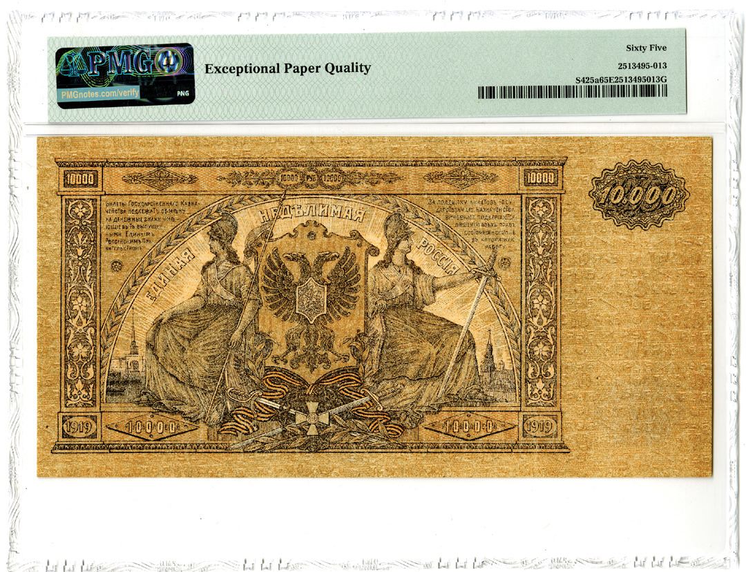 Russia, South Russia, 1919. 10,000 Rubles, P-S425a, Issued Banknote. Black on brown, green, tan, and m/c underprint. Block AM-009. PMG graded Gem Uncirculated 65 EPQ.