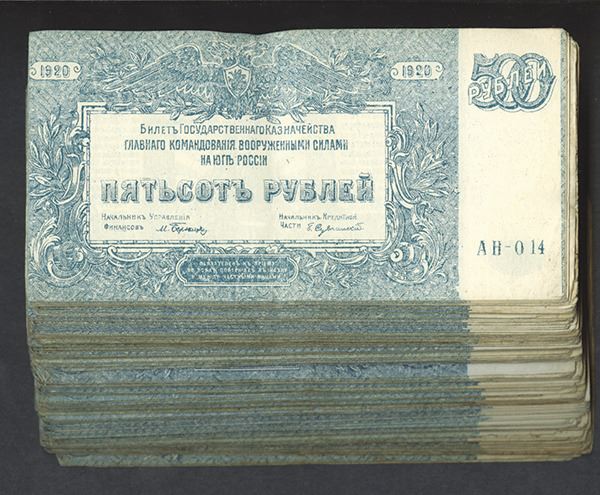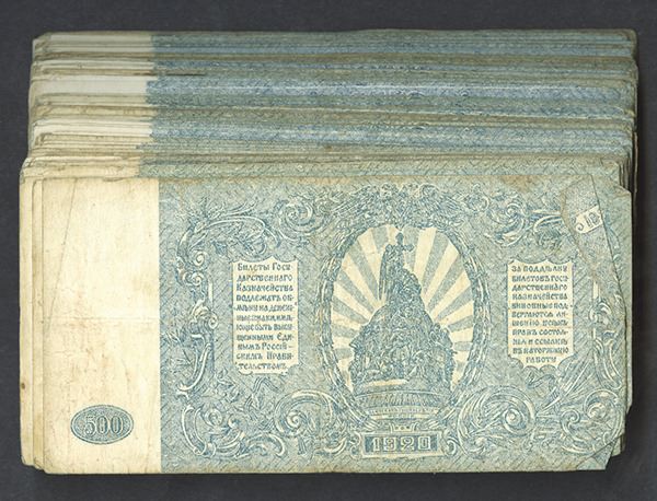 Russia, South. 500 Rubles. P-S434. Dobule headed eagle at top on face; Monument to the Millennium of Russia on back. Mostly Fine to Very Fine, with some better. Slight mildew odor when confronted as a group. 200 pieces.