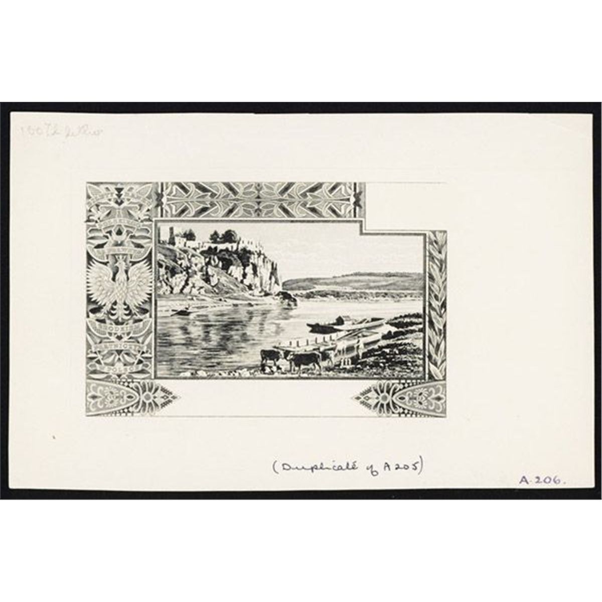 Warsaw, Poland, 15 Sierpnia 1939 R., 100 Zlotych, P-85 (Not issued) Unlisted Progress Proof Face that is partially printed in black instead of issued brown with no underprint and missing text and other design elements, on off white paper. Back blank, Man with mustache on right, Small edge faults on right margin far from design that could be trimmed off if desired, Archival ink notations on bottom (Duplicate of A202 - A201), Choice AU to Uncirculated condition, Rare note in any form and especially as a color trial Progress proof and very possibly unique in this format. No TDLR imprint in middle bottom. TDLR.