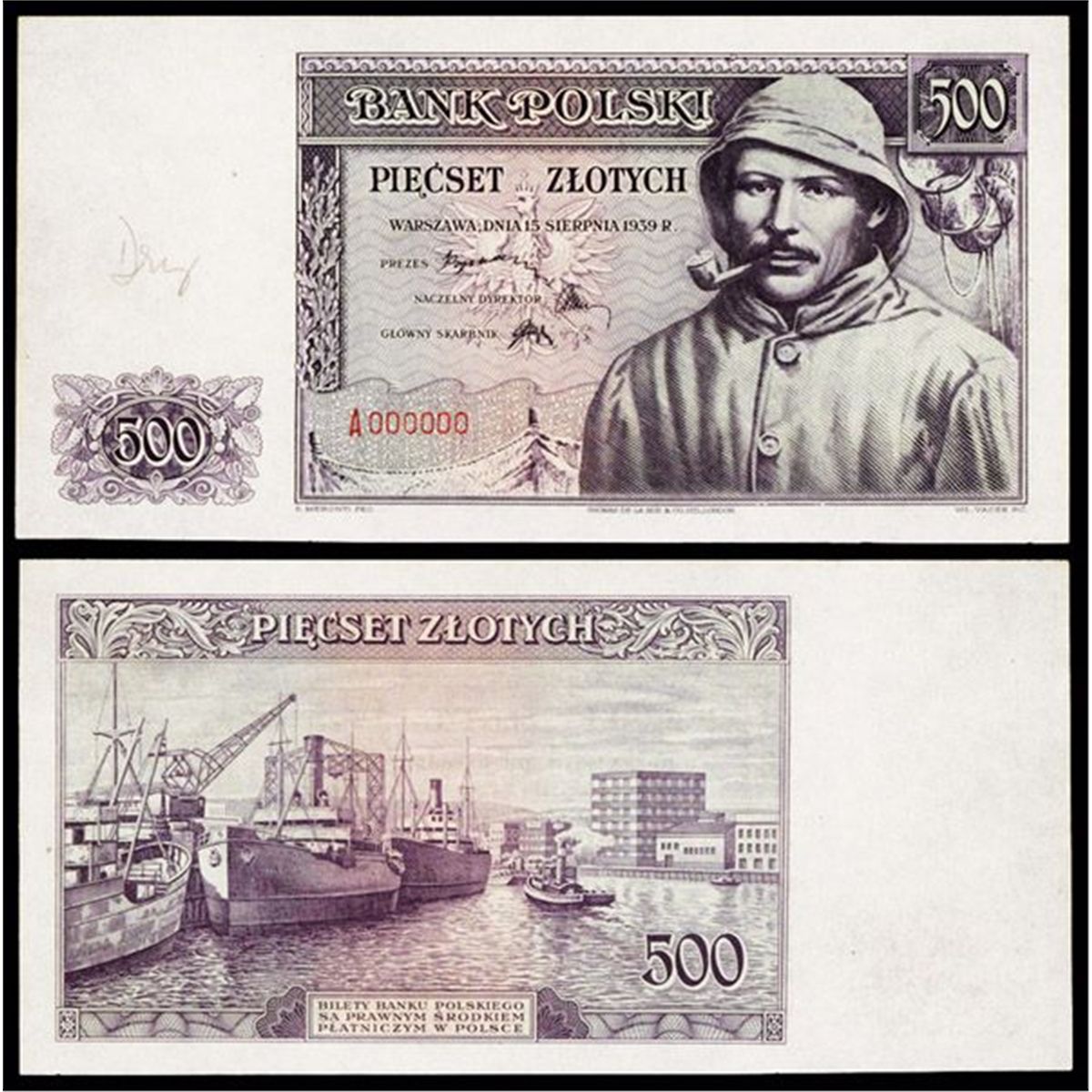 Warsaw, Poland, 15 Sierpnia 1939 R., 500 Zlotych, P-86 (Not issued) Specimen banknote, Sailor with pipe on right, purple on m/c, back purple with harbor scene with steamships, S/N A000000 in red, One very light internal fold keeps this Choice AU-Uncirculated note from Choice Uncirculated condition, Archival notation on left counterfoil area written in pencil -DRY- possibly referring to the printing method or paper condition used to print the note, TDLR.