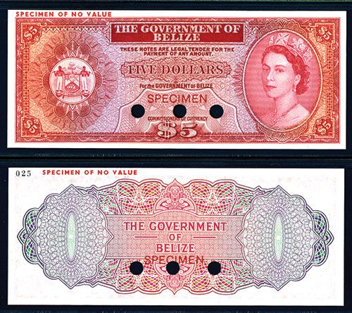 Belize, ND (1974-76), $5, P-35s, Specimen banknote, red on m/c, Red specimen overprint and POC's. S/N 025, PMG graded Superb Gem Uncirculated 67 EPQ, the highest grade given by PMG of the 8 notes graded. A trophy for any Belize collector.