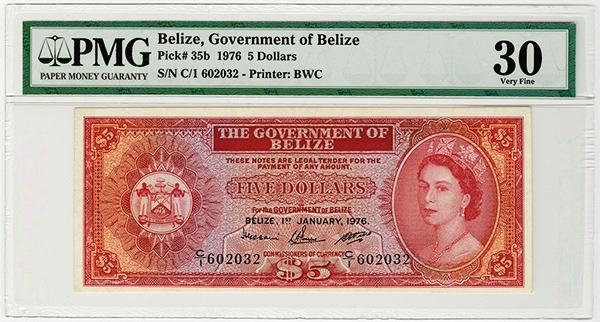 Belize. Issued 5 Dollars, 1976, P-35b. PMG graded Very Fine 30 (Cert # 5003597-011). BWC.