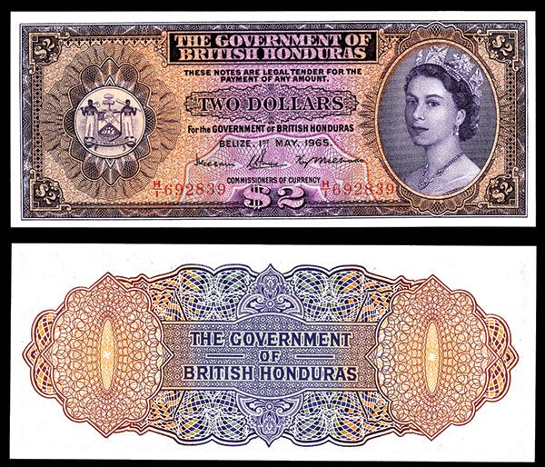Belize, 1st May 1965, $2, P-29b, Issued banknote, Purple on m/c, Queen Elizabeth II on right, Gem to Superb Gem Uncirculated. Deep embossing and bright colors enhance this attractive note.