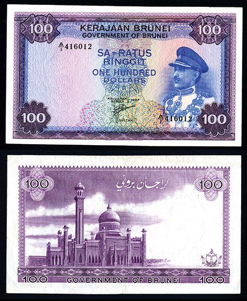 Brunei, 1967, 100 Ringgit, P-5, Issued banknote, Blue on purple and m/c underprint, S/N A/1 416012, VF to VF+ condition, BWC. Attractive note for the grade.