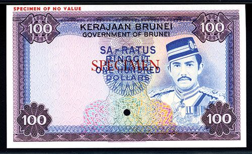 Brunei, ND (1972-88), 100 Ringgit, P-10cts, “Color Trial Specimen”, Purple on blue and m/c instead of issued blue on m/c with Sultan Bolkiah I on right, back purple with mosque, Specimen overprint and POC, PMG graded Superb Gem Uncirculated 67 EPQ (Exceptional Paper Quality)”, a trophy note in this grade that will be difficult if not impossible to improve upon. The only one graded in the PMG census and a superb grade. BWC.