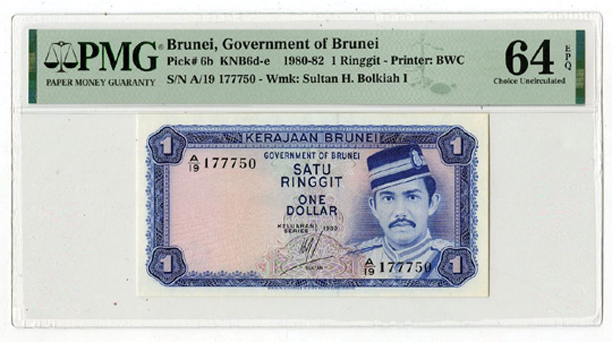 Brunei, 1980. 1 Ringgit, P-6b, Issued Banknote, Blue on purple and m/c underprint with Sultan H. Bolkiah I at right, Back is Blue on pink underprint, S/N A/19 177750, PMG graded Choice Uncirculated 64 EPQ, BWC.