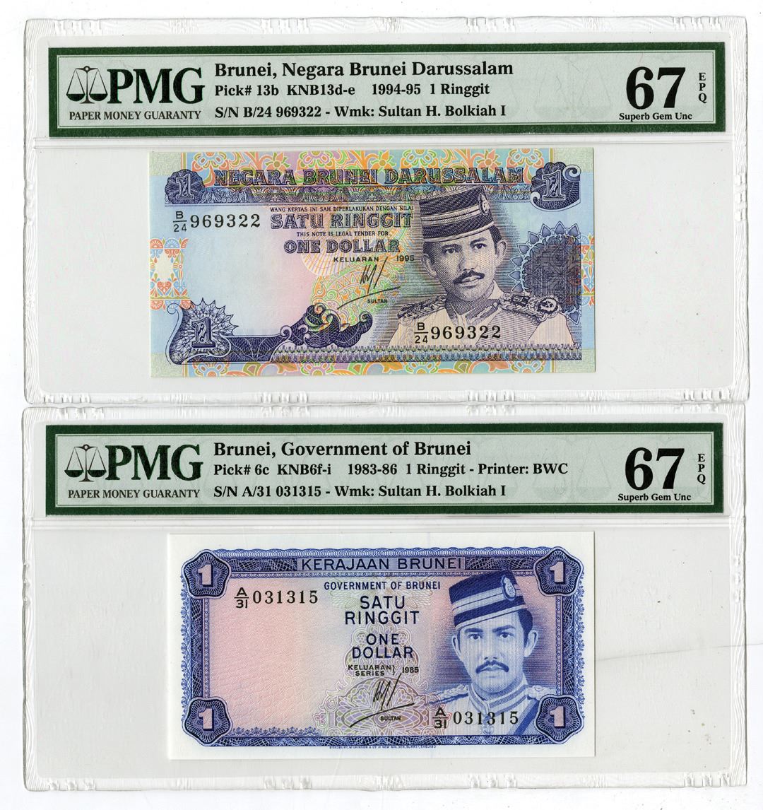 Brunei, 1983-86 - 1994-95. Lot of 2 Issued Banknotes, Includes: Government of Brunei 1 Ringgit, P-6c KNB6f-I, Blue on pink underprint, Portrait of Sultan Hassanal Bolkiah I at right, S/N A/31 031315, BWC; and, Negara Brunei Darussalam 1 Ringgit, P-13b KNB12d-e, Blue on m/c underprint, with Portrait of Sultan Hassanal Bolkiah I at right, S/N B/24 969322. Both notes are PMG graded Superb Gem Uncirculated 67 EPQ. (2). Sold "AS IS" no returns accepted.