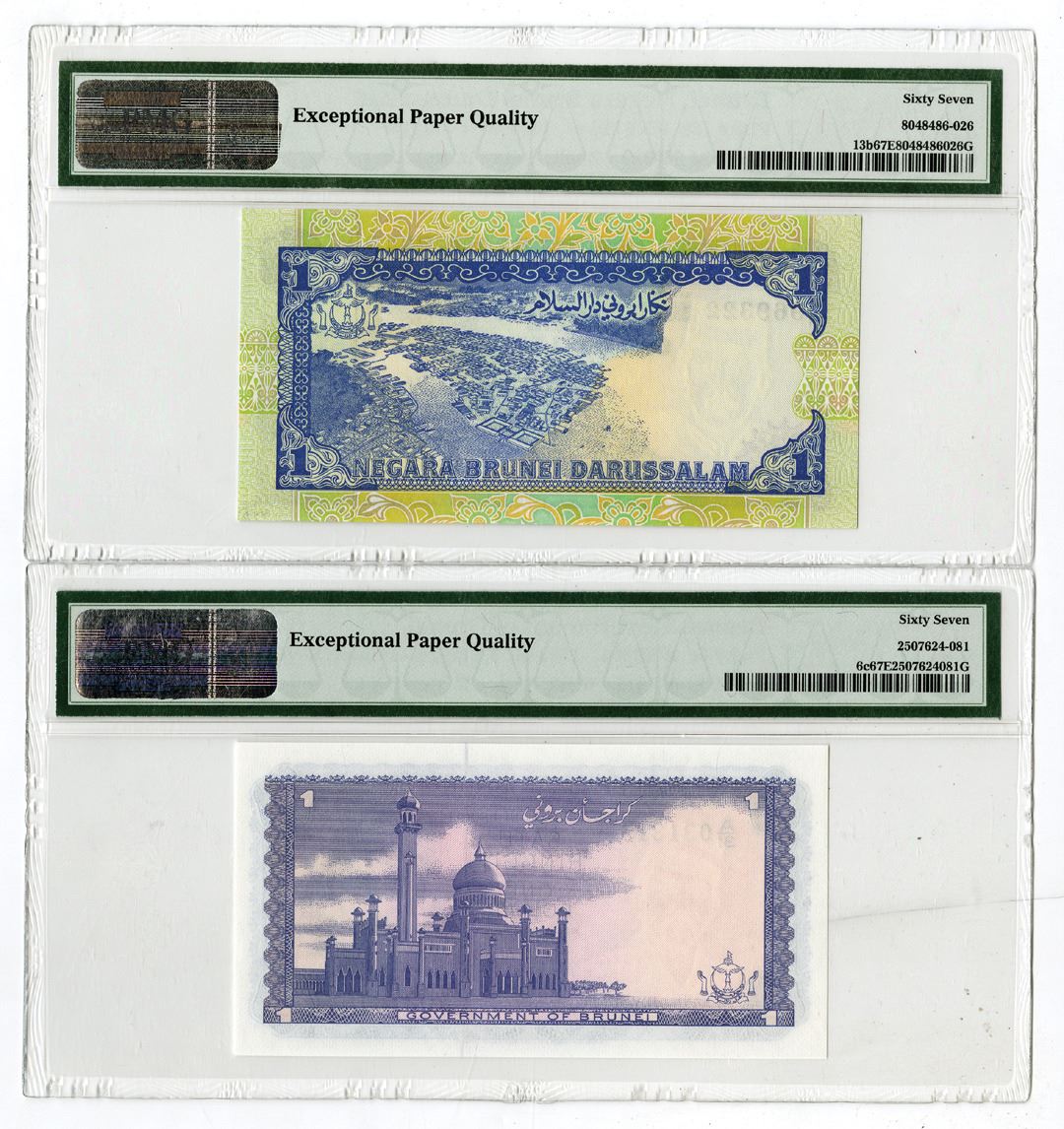 Brunei, 1983-86 - 1994-95. Lot of 2 Issued Banknotes, Includes: Government of Brunei 1 Ringgit, P-6c KNB6f-I, Blue on pink underprint, Portrait of Sultan Hassanal Bolkiah I at right, S/N A/31 031315, BWC; and, Negara Brunei Darussalam 1 Ringgit, P-13b KNB12d-e, Blue on m/c underprint, with Portrait of Sultan Hassanal Bolkiah I at right, S/N B/24 969322. Both notes are PMG graded Superb Gem Uncirculated 67 EPQ. (2). Sold "AS IS" no returns accepted.