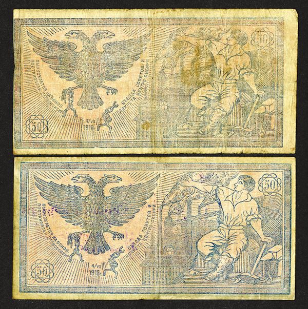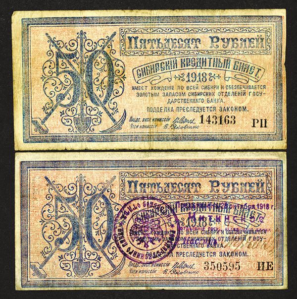 Russia - Siberia & Urals. 50 Rubles. P-S961a, b. With and without purple hand stamp. Blacksmith on back, double headed eagle with chains broken. Very Good to VF. 2 pieces. (The Silicon Valley Collection)