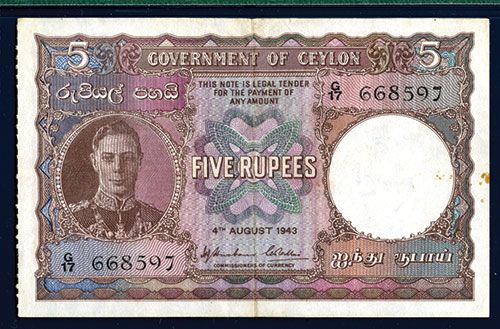 1943, 5 Rupees, P-36, Issued banknote, King George VI on left, Wmk: Chinze, Pattern, PMG graded Extremely Fine 40 NET with note of small spots of rust on right middle margin, Perforated on left margin.