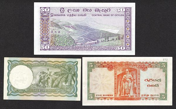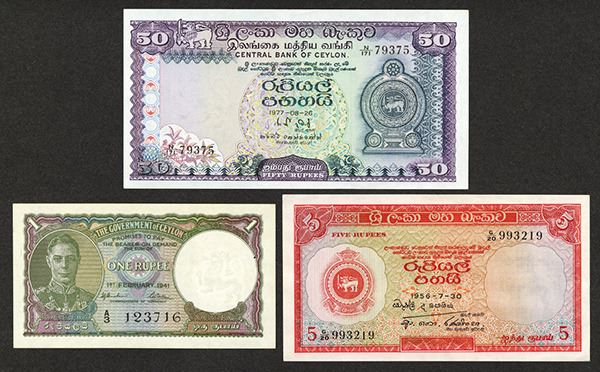 Ceylon. 1, 5, 50 Rupees. P-31a, 58a 30.7.1956 first date of the type; 81. First is EF, others Choice Uncirculated. 3 pieces.