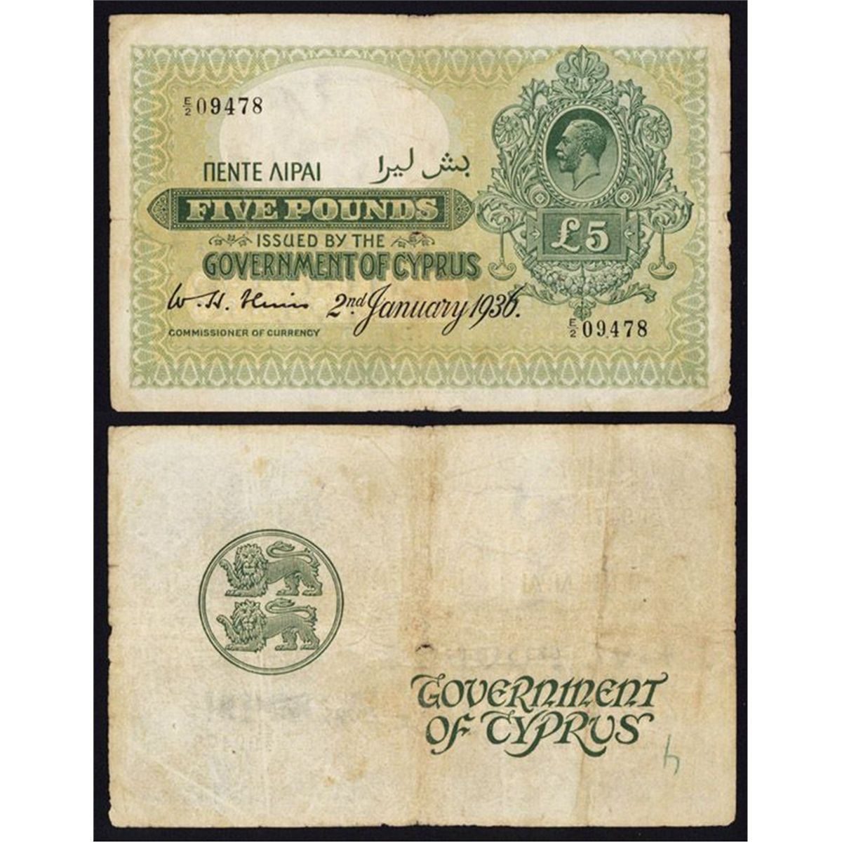 Cyprus, 2nd January 1936, £5, P-19, Issued, Dark green on light green, King George V on right, back green, serial E/2 09478. This note grades Fine, the colors bright and vivid. A great George V portrait rarity. This note has been off the market since the mid-1980's.