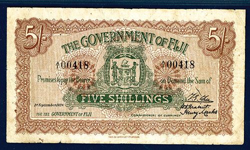 Fiji, 1st September, 1920. 5/- Shillings, P-25c, Issued banknote, Signature Brabant | Marks, Green on brown underprint, S/N A/1 00418, PMG graded Very Fine 20, NET with notation of rust (small spots) and internal tear (approximately 3-4mm's). Attractive note that is missing from most collections. TDLR. Only 2 graded by PMG, this being one.
