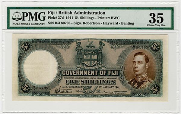 Fiji. Issued 5 Shillings, 1941, P-37d. PMG graded Choice Very Fine 35 (Cert # 5003607-007). BWC.