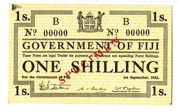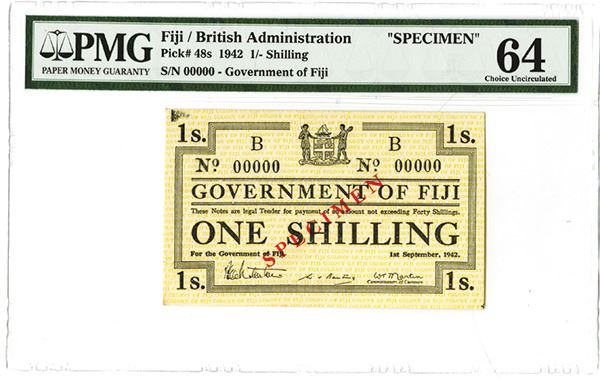 Fiji, specimen 1 Shilling, P-48s, S/N 00000, overprinted SPECIMEN, PMG graded Choice Uncirculated 64.
