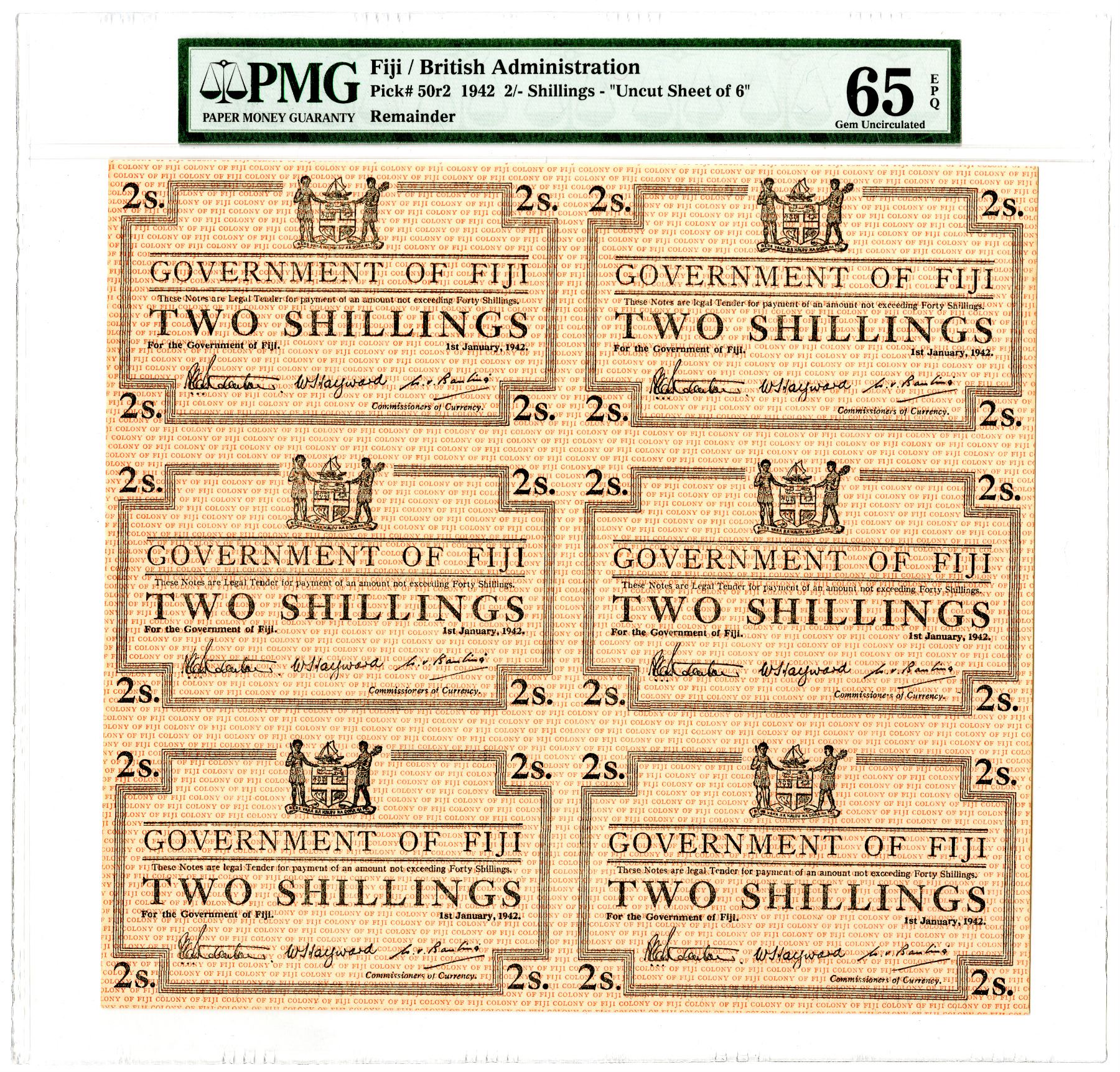Fiji-British Administration, 1942. Uncut sheet of six remainder 2 Shillings, P-50r2, Banknotes, Black with red/pink underprint, Seal of Fiji at top center, PMG graded Gem Uncirculated 65 EPQ. Tied as highest graded sheet out of 13 graded.