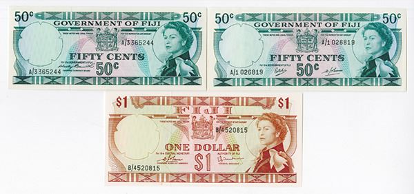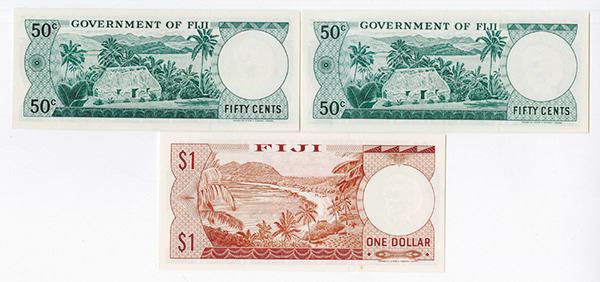 Bahamas. Lot includes 50 Cents, P-58, Choice Extremely Fine; 50 Cents, P-64, About Uncirculated; and 1 Dollar, P-71, Uncirculated with small stain.