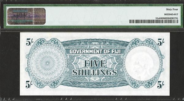Fiji, 5/- Shillings, P-51e, Issued banknotes, PMG graded Choice Uncirculated 64.